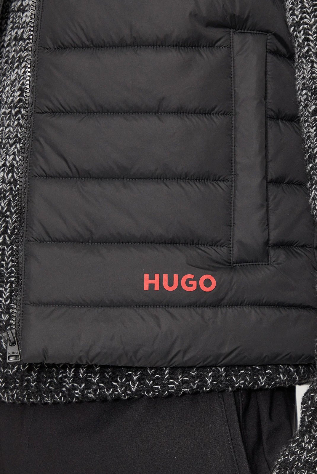 50517743 – Hugo boss. Tonos: el AZUL. corte: pitillo. Cuello : creciente. mangas: sin. Logo: estampo. Bolsa: 2. Relleno: sintético. Cierre: cremallera. Lavado: Lavado máquina. Materia: 100% Poliamida.