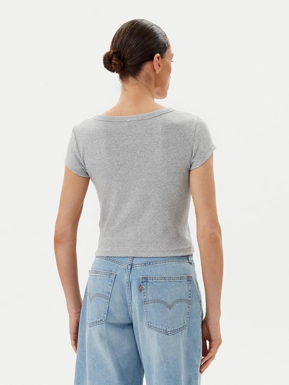 Tonos: el GRIS. corte: pitillo ajustado. Cuello : redondo. mangas: cortas. Logo: parcheado. Lavado: Lavado máquina. Consejo: toma tu talla habitual. Materia: 95% Algodón, 5% Elastano.