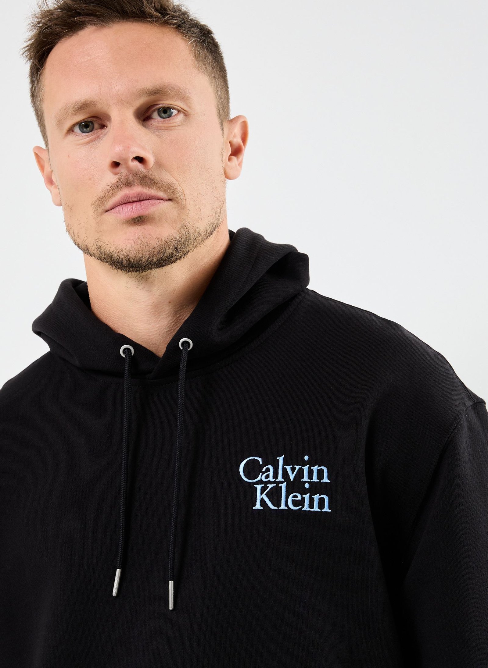 Tonos: los NEGROS. corte: de gran tamaño. Cuello : con capucha. mangas: largas. Logo: bordado. Bolsa: pocos ventrales. Cierre: para enhebrar. Lavado: Lavado máquina. Consejo: toma tu talla habitual. Materia: 90% Algodón, 10% Poliéster reciclado.